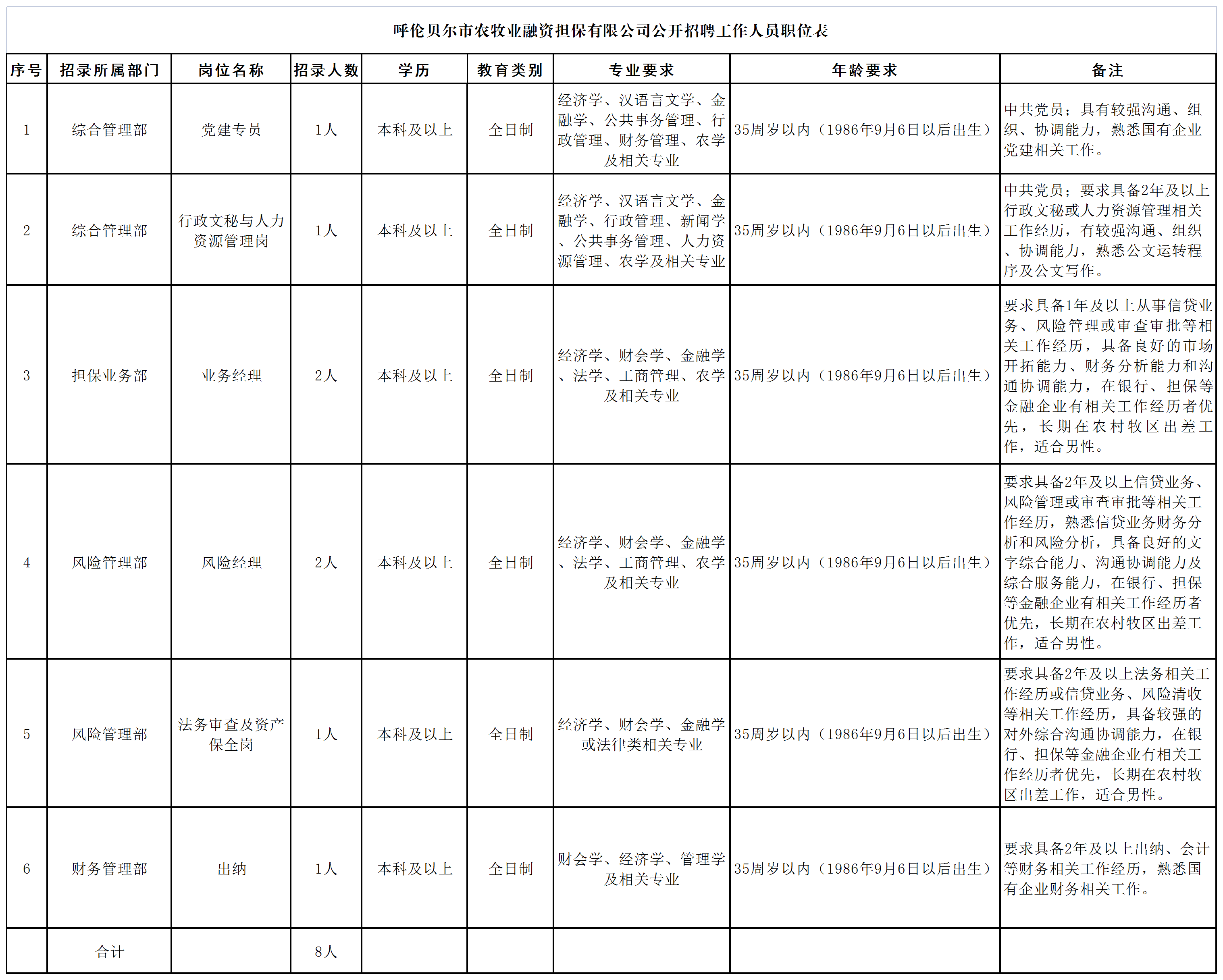 呼倫貝爾市農(nóng)牧業(yè)融資擔(dān)保有限公司公開招聘工作人員簡章