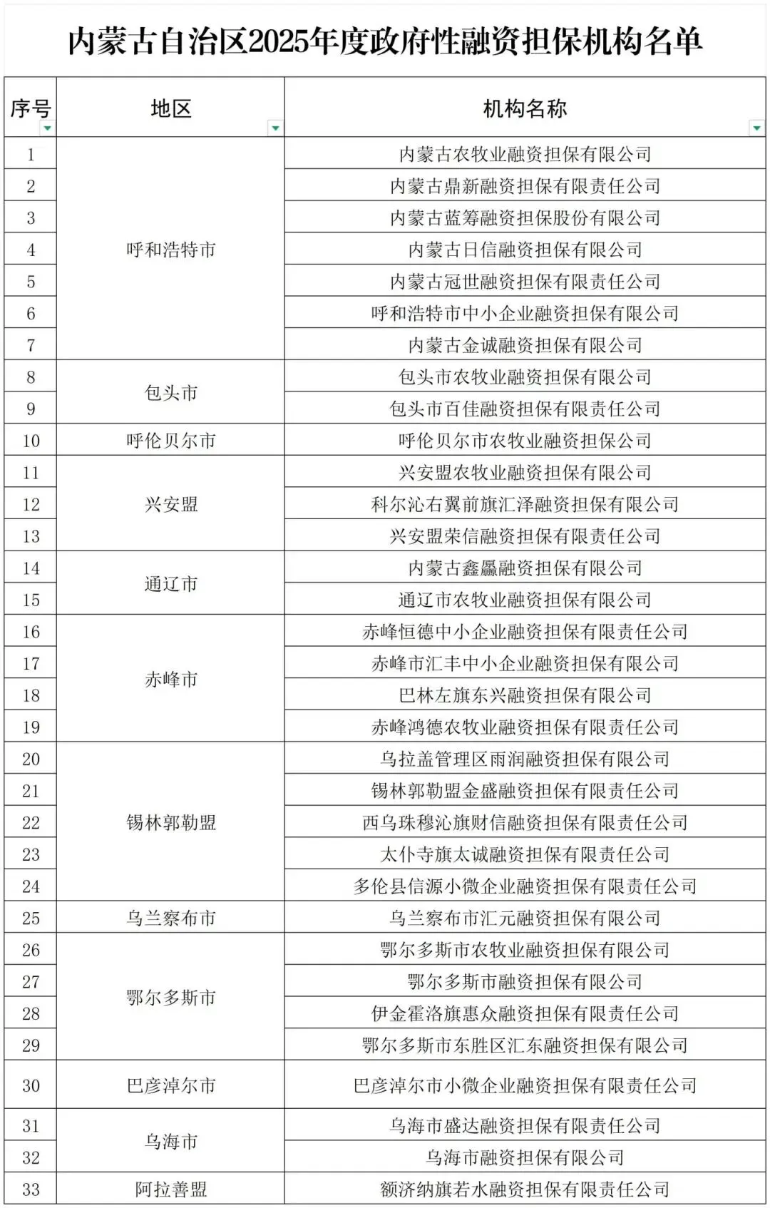 為規(guī)范政府性融資擔(dān)保機(jī)構(gòu)行為,充分發(fā)揮政府性融資擔(dān)保機(jī)構(gòu)作用,引導(dǎo)其更好服務(wù)小微企業(yè)和“三農(nóng)三牧”等市場主體,加強(qiáng)自身能力建設(shè)。根據(jù)《內(nèi)蒙古自治區(qū)財政廳 地方金融管理局關(guān)于2025年申請納入政府性融資擔(dān)保機(jī)構(gòu)名單管理的通知》(內(nèi)財金〔2025〕758號)相關(guān)要求,通過各盟市財政局、呼和浩特市地方金融管理局初審評分,自治區(qū)財政廳、地方金融管理局對申報材料及評分結(jié)果復(fù)核,本次公布我區(qū)33家政府性融資性擔(dān)保機(jī)構(gòu)納入名單管理。